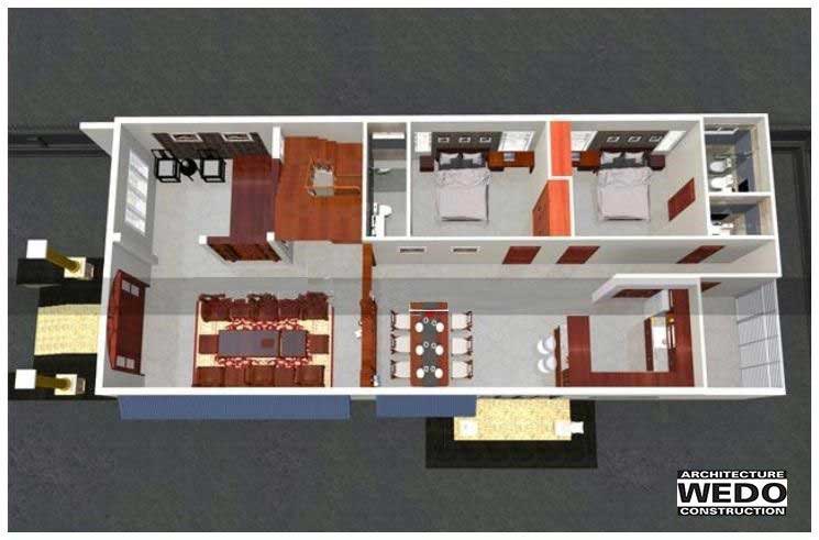 Phòng bếp: Khuôn viên phòng bếp bố trí riêng biệt cuối nhà nằm liền kề với khu vực ăn uống của cả gia đình. Căn phòng này được thiết kế cánh cửa thoát khí nhỏ tránh làm ảnh hưởng đến các căn phòng xung quanh vào những lần sản xuất các món ăn ngon.