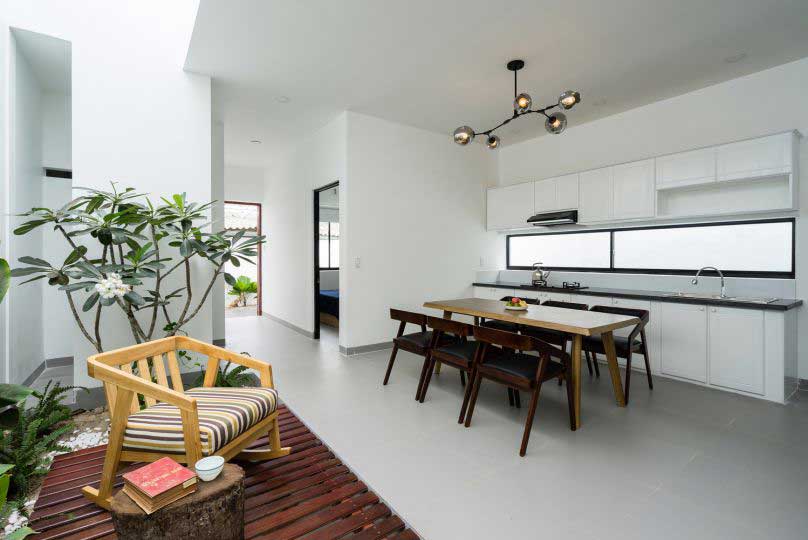 Các không gian sẽ được ngăn cách nhau bằng cách sử dụng các đồ nội thất. Đồng thời, sẽ có một khu vườn bên trong và 1 hệ cửa sổ được thiết kế rộng mở, diện tích thông thoáng để tăng khả năng đón ánh sáng và tạo khoảng không gian mát lành cho gia đình.