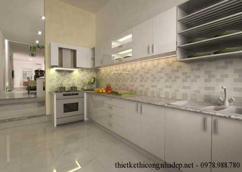 Nội thất nhà bếp bắt mắt với thiết kế đá grannite trắng. Đồng thời, tủ bếp được làm từ gỗ công nghiệp cùng tông màu trắng, tạo sự nhẹ nhàng, tinh tế và sạch sẽ, bóng bẩy.