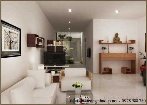 Phòng khách là một không gian khá đơn giản nhưng vẫn thể hiện tất cả phong cách của chủ nhà. Những người yêu thích sự nhẹ nhàng và tinh tế với bộ ghế sofa đơn giản kết hợp với tranh treo tường, giá sách trang trí, ngay trong phòng khách, bàn thờ sẽ được bố trí hợp lý.