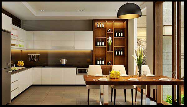 Không gian bếp hiện đại hiện đại nhưng đầy sự ấm áp. Hiện đại xuất hiện ở tủ bếp màu trắng với chất liệu gỗ công nghiệp. Sự ấm áp hiện diện ở bàn gỗ kết hợp với ánh sáng vàng tạo không gian gia đình quây quần bên mâm cơm ấm áp. Không gian bếp cùng bàn ăn kết hợp với phần cửa phía sau nhà. Phần cửa này được làm bằng kính để lấy ánh sáng vào trong không gian phòng, thông thoáng mùi.