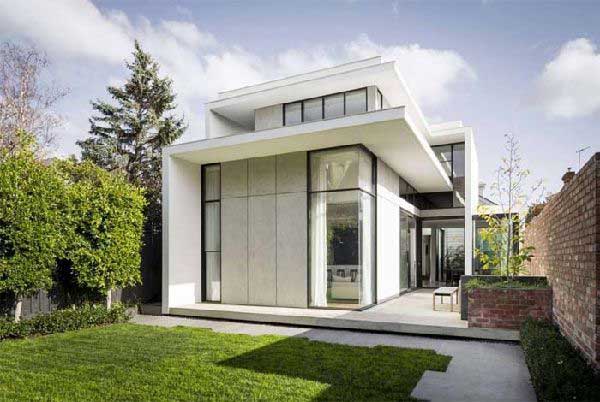 Lựa chọn phong cách kiến trúc hiện đại với khối hộp vuông vức để tối đa được diện tích sử dụng phía bên trong của ngôi nhà. Sơn trắng cùng hệ thống cửa kính cũng là đặc điểm nổi bật khi lựa chọn phong cách kiến trúc này. Phần mái bằng giúp cho ngôi nhà trở nên nhỏ gọn hơn, phù hợp với diện tích nhỏ của mẫu nhà này.
