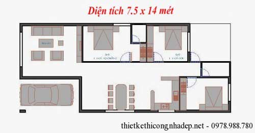Thiết kế mặt bằng nhà cấp 4 sẽ bao gồm 1 phòng khách, 3 phòng ngủ và 1 phòng bếp + phòng ăn. Đối với mẫu nhà cấp 4 nhiều gia chủ đã quyết định bố trí phòng vệ sinh bên ngoài hợp lý và thuận tiện. Dự kiến chi phí xây dựng căn nhà sẽ là 400-450 triệu, với diện tích đất xây dựng: 7.5x14m và diện tích nhà cấp 4: 100m2