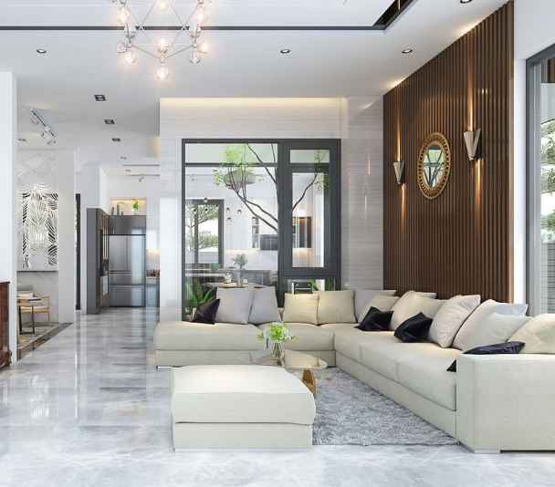 Phòng khách được xem như mặt tiền của ngôi nhà nên không gian nhận được rất nhiều sự quan tâm của gia chủ. Phòng khách của mẫu nhà cấp 4 mái thái này sang trọng và trang nhã với gam màu trắng sáng và nội thất hiện đại.