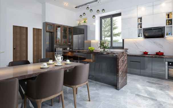 Khu vực phòng ăn + bếp trong mẫu nhà cấp 4 có gác lửng 7x10m thực sự tạo nên một bữa cơm nóng cho gia đình và hiện đại nhất. Nếu phòng ăn ấn tượng với chất liệu gỗ công nghiệp, được đính đá lấp lánh thì bàn ghế ăn phong cách hiện đại lại có khả năng phản chiếu ánh sáng cực tốt. Cũng giống như phòng ăn, không gian bếp cũng được thiết kế theo phong cách đơn giản, hiện đại mang đến không gian rộng rãi cho việc đứng nấu nướng. Việc sử dụng màu đen trắng trong nội thất và sử dụng ánh sáng vàng sẽ mang lại nhiều cảm hứng cho quá trình nấu nướng của các đầu bếp tại gia. Hai không gian còn kết hợp ánh sáng tự nhiên và đèn chùm để tăng thêm sự lung linh, quyến rũ cho không gian ngay cả khi về đêm.