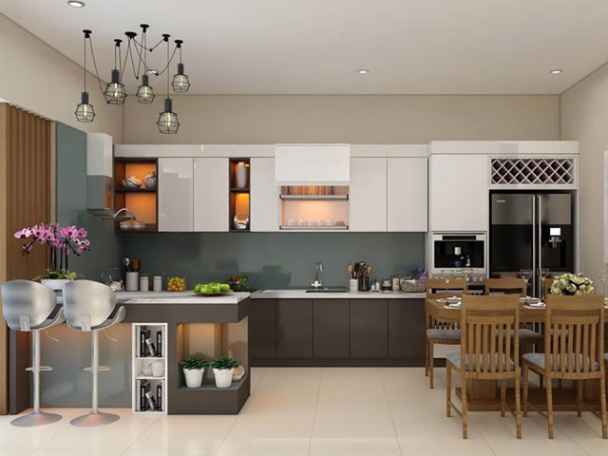 Khu vực bếp được bài trí gọn gàng với tủ bếp cánh phẳng màu trắng nhạt sang trọng. Bàn bếp mở rộng trở thành quầy bar mini tiện lợi cho hai người cùng một lúc.