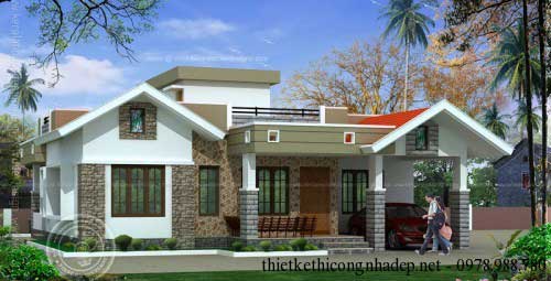 Điểm nhấn của mẫu nhà này là phần lan can mái được xây tạo cách điệu. Phần mái Thái nổi bật giữa không gian, diện tích xây dựng: 111.14 m. Mẫu nhà này bao gồm 1 phòng khách, 1 phòng kết hợp giữa bếp và phòng ăn, 2 phòng ngủ, 1 không gian làm việc riêng tư và 1 nhà kho.