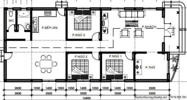 Mặt bằng nhà cấp 4 ngang 6m dài 16m