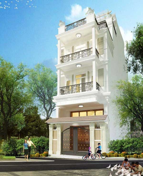 Mẫu nhà mặt phố 5m có tông màu trắng kem xây dựng theo lối kiến trúc tân cổ điển, mẫu lan can thời thượng và mái Thái là một lựa chọn tuyệt vời cho những gia đình trẻ. Mẫu nhà mặ phố 5m này độ rộng mặt tiền vừa phải và thiết kế mới lạ, nhiều công năng đảm bảo hài lòng những gia chủ khó tính nhất. Mái Thái vừa đẹp, vừa hiện đại lại có thể giúp căn nhà thoát nước, chống ẩm, chống thấm dột vào mùa mưa tốt do có độ dốc của mái. Thật sự mẫu nhà phố 5m này độ thẩm mỹ có thể hài lòng tất cả mọi người. Với những ai muốn có một phong cách riêng để khẳng định đẳng cấp của mình thì mẫu nhà này chắc chắn sẽ khiến bạn hài long.