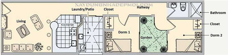 Trong phương án này, thiết kế có phần mới lạ hơn, khi cũng nối liền hai không gian bếp với phòng khách, tuy nhiên sẽ kết hợp xây dựng một khu vườn nhỏ ngăn cách giữa các phòng ngủ, tạo cảm giác thoải mái, dễ chịu.