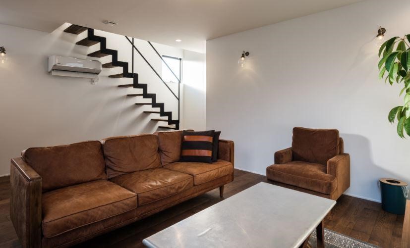 Quay lại phối cảnh được chụp tại phòng khách, nhưng bạn có thể nhận thấy cầu thang nằm cạnh bộ sofa là đường để hướng lên phần gác lửng phía trên là 2 phòng ngủ liền kề và 1 nhà vệ sinh. Chia đều không gian ra 2 mảng riêng biệt với phần bên trên là không gian nghỉ ngơi và phía dưới là nơi sinh hoạt tập thể như phòng khách, nhà bếp, nhà vệ sinh…vv.