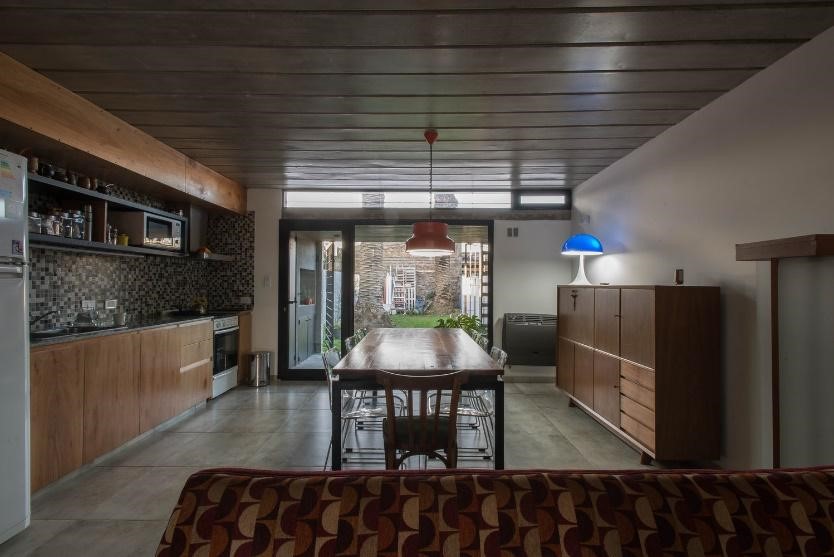 Gia chủ đã kéo dài khoảng sân vườn đến hết vị trí của 2 phòng ngủ. Đây thể là mong muốn hoặc sở thích của họ để mang lại màu sắc hoàn toàn mới bởi số lượng thành viên trong nhà không quá nhiều. Không thể không nhắc đến hệ thống nhà bếp nhỏ gọn kết hợp bàn ăn nằm cạnh bên, gia chủ có thể thuận tiện sinh hoạt bên trong. Điểm nhấn của nhà bếp là hệ thống gỗ ốp tường mang đúng màu sắc tạo hên một khối hình vuông.