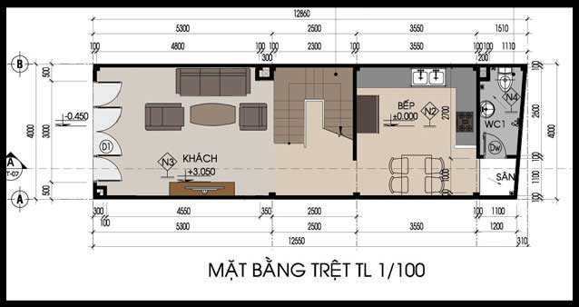 Chị Loan là một trong những khách hàng khá kỹ tính, chỉn chu. Chị đã vạch ra rất nhiều yêu cầu cũng như mong muốn của gia đình về mẫu nhà ống 2 tầng 1 tum mặt tiền 4m có sân thượng. Do đó chúng tôi lại càng ý thức được trách nhiệm cũng như trọng trách mà mình đang mang. Mặt bằng công năng được chúng tôi thiết kế rất chỉnh chu.