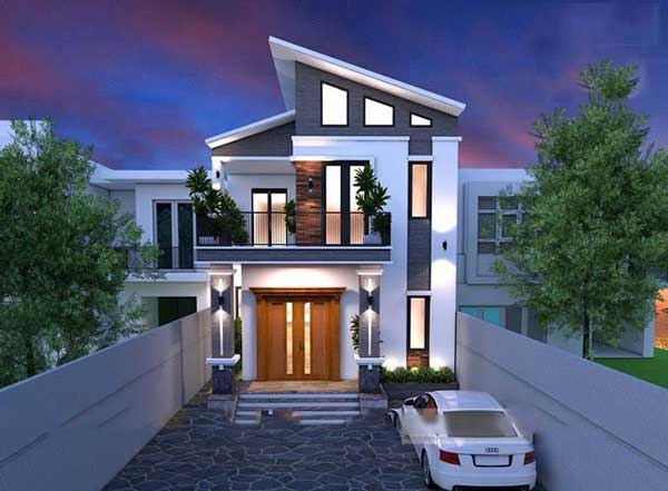 Để mở đầu cho một không gian hiện đại chúng ta cùng nhau ngắm nhìn mẫu nhà 2 tầng mái lệch với gam màu chủ đạo là màu trắng sáng kết hợp với màu xám tinh tế, tạo điểm nhấn ở cột nhà và một số chỗ trang trí. Ngôi nhà được thiết kế ấn tượng với cửa chính bằng gỗ tự nhiên bền khỏe, các ô cửa phòng chức năng bằng kính đón ánh sáng.