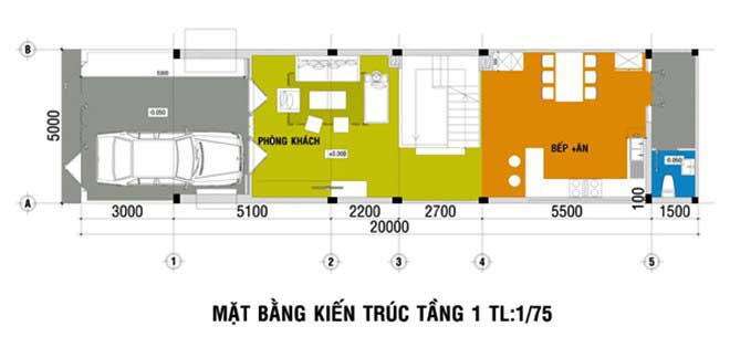 - Công năng mặt bằng tầng 1: sân để xe hơi riêng, phòng khách, phòng bếp ăn, phòng vệ sinh chung.