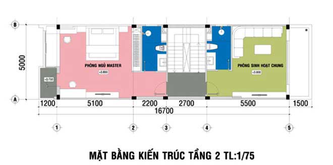 - Công năng mặt bằng tầng 2: phòng ngủ cho bố mẹ có phòng vệ sinh riêng, phòng sinh hoạt chung.
