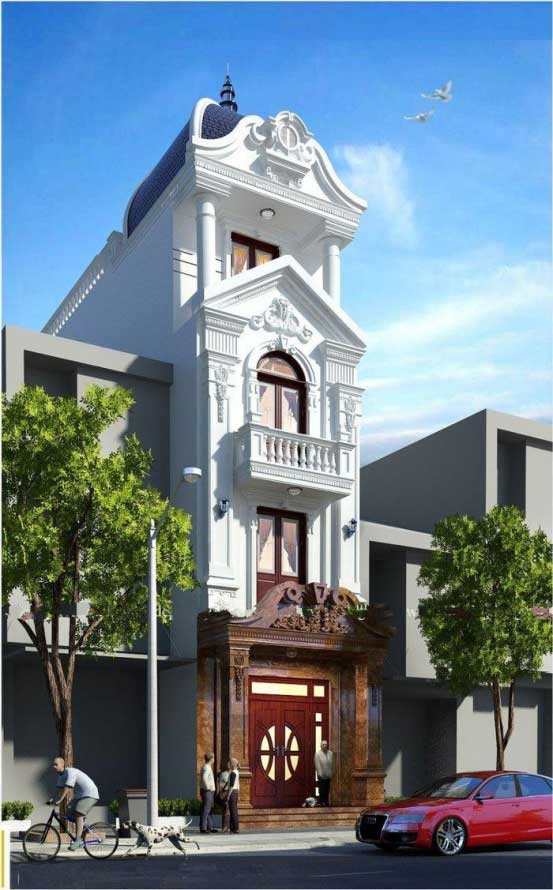 Thì xu hướng thiết kế nhà ống phong cách Cổ Điển không bao giờ lỗi thời tại đây có thể đang là điều bạn tìm kiếm. Như mọi người cũng biết với những kiến trúc Cổ Điển thường có giá trị khá cao so với các phong cách hiện đại, điều đó đồng nghĩa với việc chi phí đầu tư xây dựng nhiều hơn. Nét đẹp hoàn hảo từ các chi tiết hoa văn phức tạp, cùng với màu sắc sang trọng khẳng định giá trị của chủ đầu tư. Vì là phong cách Cổ Điển, nên các họa tiết trang trí mặt tiền nhà ống đẹp này có phần hơi phức tạp và nhiều hoa văn. Mẫu nhà ống 4 tầng cổ điển xây dựng trên tổng diện tích chỉ 80m2 (5 x 16), tận dụng các công năng bên trong một cách khoa học. Với đường nét khỏe khắn, màu sắc tinh tế và kiến trúc đồ sộ này sẽ gây ấn tượng tuyệt đối với những vị khách nào lần đầu tiên nhìn thấy. Không để bạn phải chờ đợi lâu, cùng chúng tôi điểm ngay qua phương án thiết kế nhà ống 4 tầng đậm nét phong cách Pháp được yêu thích tại đây.