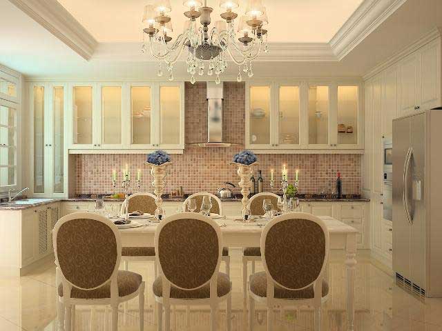 Nội thất nhà bếp lấy tông màu trắng kem tạo sự nhã nhặn và ấm cúng.