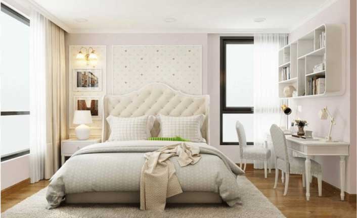 Phòng ngủ dành cho cặp vợ chồng sử dụng tông màu trắng sáng.