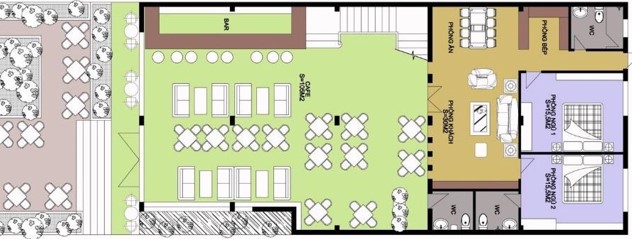 Mặt bằng tầng 1 : chính là không gian mà gia đình kết hợp với một mô hình kinh doanh một cách hiệu quả khi các tiện ích bên trong đã được khai thác tối đa từ diện tích khá lớn lên đên 20m. Khi phần không gian phía sau vẫn đủ cho việc kết hợp với 1 không gian nhà bếp, 1 phòng khách và 2 phòng ngủ nhỏ gọn. Với 2 nhà vệ sinh 1 dùng cho khách hàng và 1 dành cho gia đình sử dụng.