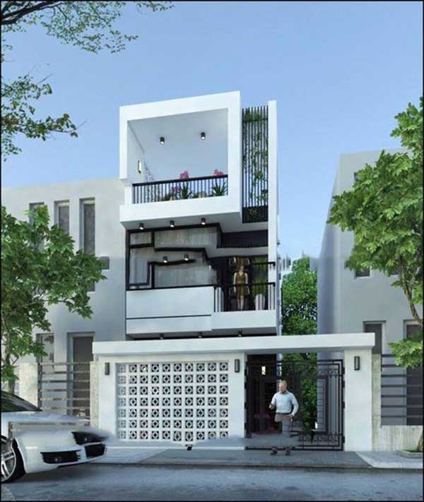 Khoác lên mình màu áo trắng tinh khôi, tươi mới, mẫu nhà phố 5x12 nhanh chóng thu hút được đông đảo giới đầu tư xây dựng. Ngoài việc mang lại những công năng hữu ích, căn nhà kết hợp sử dụng các chi tiết thiết kế thanh sắt song song như lan can và lam chắn rất mới mẻ và hiện đại. Tường rào sử dụng gạch thông gió xếp chồng họa tiết màu trắng tạo nên sự thông thoáng cho căn nhà mà còn mang tính thẫm mỹ cao. Là mẫu nhà mang hơi hướng thời đại mới mẻ, rất được ưa chuộng hiện nay.