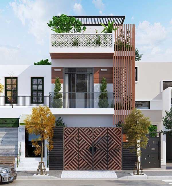 Mẫu nhà phố 5x12 được xây dựng theo kiểu nhà ống nhỏ gọn. Tầng 2 được ốp bằng các tấm gạch màu vân gỗ kết hợp cùng lam chắn song song bao trùm lên tạo nên một sự mới mẻ và bức phá trong lối thiết kế. Gam màu trắng nổi bật hòa quyện cùng màu đen và màu vân gỗ tạo nên sự hài hòa về màu sắc, người ngoài nhìn vào cũng khá dễ chịu. Công năng được bố trí đầy đủ và tiện ích, là mẫu nhà phố hiện đại được ưa chuộng và đầu tư rất nhiều ngày nay.