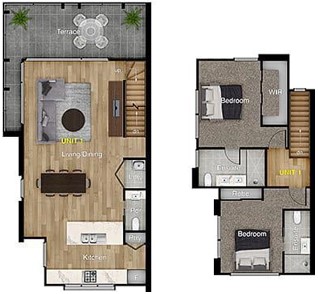 Với nguồn chi phí có phần thoải mái thì việc tìm đến với kết cấu từ 2 tầng là một phương án khả quan khi bạn và gia đình có thể sử dụng một cách tiện nghi nhất. Dựa trên 2 mặt bằng mà có thể phân bổ các chức năng một cách cụ thể, mà theo bản vẽ phía trên bạn có thể thấy không gian một cách chân thực nhất với tầng trệt gồm : 1 nhà bếp, 1 phòng khách vô cùng thoải mái và phía sau là một khoảng sân rộng có thể sắp xếp 1 bàn ngồi thư giãn. Và mặt bằng tầng 2 với : 2 phòng ngủ, 2 nhà vệ sinh được dẫn lên bằng một cầu thang nằm chếch sang bên trái ngôi nhà. Tất cả như được sắp xếp theo một tổ chức khoa học, đề cao tính tiện dụng và tiện nghi với mọi vật liệu thông minh mà gia chủ đã áp dụng.
