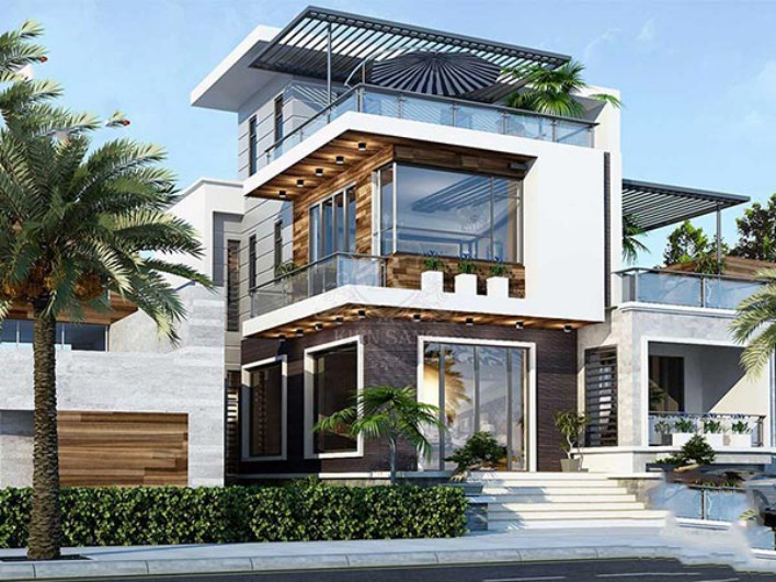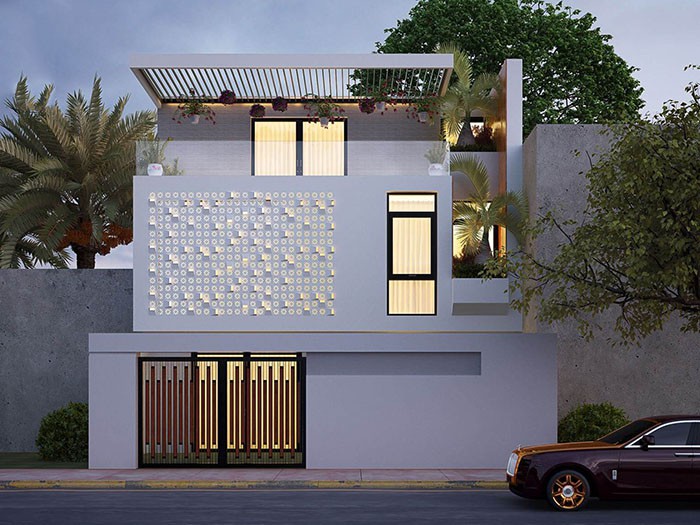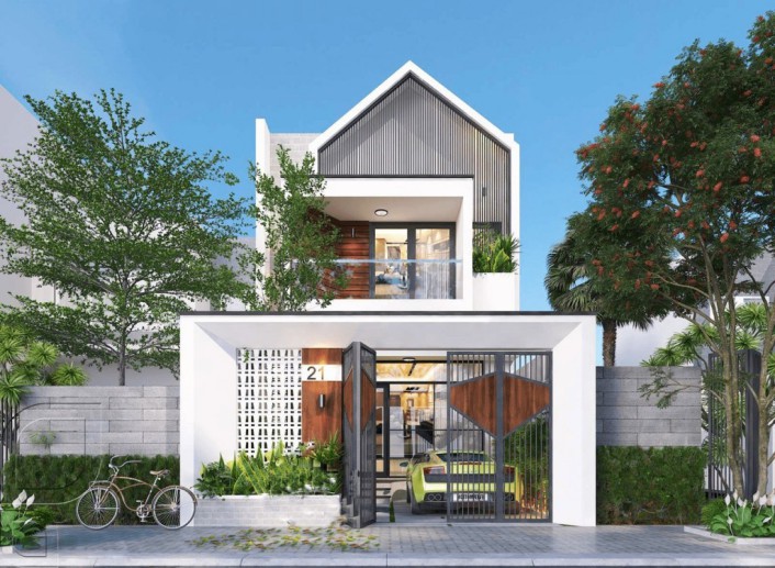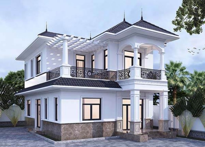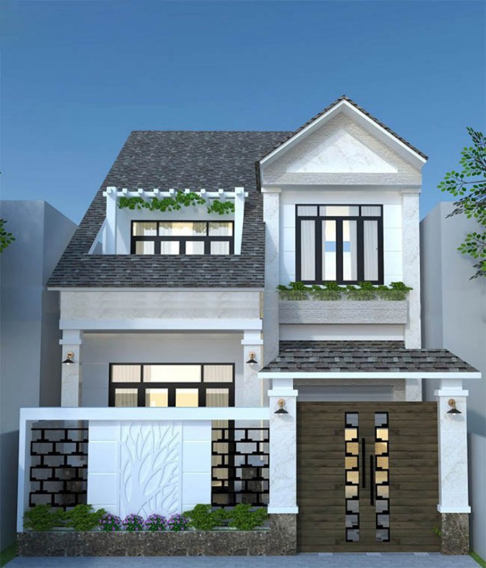 Với những gia đình ưa thích nét đẹp truyền thống thì có thể tham khảo mẫu nhà phố 2 tầng đẹp này. Ngôi nhà sử dụng mái Nhật cùng với cách trang trí truyền thống tạo nên hình ảnh quen thuộc, đáp ứng hu thẩm mỹ của những gia chủ thích sự truyền thống và sang trọng. Toàn bộ ngôi nhà sử dụng sơn màu trắng, thể hiện rõ các chi tiết trang trí nổi trên tường, tương phản với màu lan can và mái nhà. Bên cạnh đó, việc bố trí lam trên sân thượng cũng là hình thức trang trí quen thuộc. Ngoài công trình chính, phần tường rào cũng được đầu tư với hình thức bê tông kết hợp khung sắt trang trí. Điều này tạo nên nét đẹp hài hòa, sang trọng.