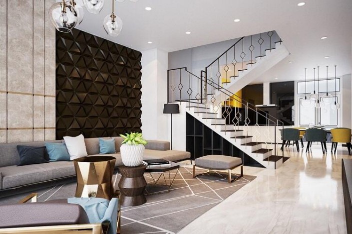Nhìn vào phối cảnh chung được thiết kế, bố trí hài hòa và ăn ý. Phòng khách hiện đại cùng với bộ bàn ghế sofa kết hợp khung kim loại mang lại cảm giác sang trọng và thông thoáng. Ngoài ra, phòng khách còn được trang trí thêm những chậu cây xanh nhỏ xinh. Cầu thang được thiết kế thanh mảnh cùng với lan can tay vịn được cách điệu độc đáo giúp cầu thang mềm mại.
