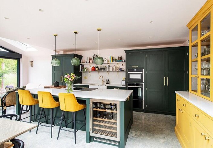 Phòng ăn được thiết kế trẻ trung, năng động với gam màu vàng nổi bật cùng màu xanh dịu nhẹ. Bộ bàn ghế ăn được làm từ sắt chắc chắn kết hợp màu sắc tinh tế, độc đáo. Bên cạnh đó, việc bố trí hợp lý cùng hệ thống bếp nấu hiện đại còn làm tăng thêm không gian mỹ quan cho nhà bếp, trông gọn gàng, đẹp mắt hơn.