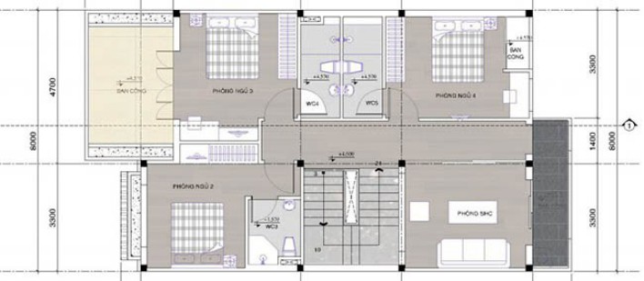 Tầng 2 bao gồm 3 phòng ngủ, mỗi phòng ngủ đều có nhà vệ sinh riêng khép kín để phục vụ nhu cầu sinh hoạt của từng thành viên, ban công thoáng mát hướng ra ngoài. Bên cạnh đó, còn có phòng sinh hoạt chung dành cho gia đình. Phòng thờ được đặt phía ngoài ban công tầng 2, quay ra mặt tiền hợp hướng với phong thủ. Tiếp đến là không gian riêng tư của phòng ngủ, toàn bộ không gian phòng ngủ đều được bố trí giường đôi, màu sắc tùy theo sở thích của từng người, bàn học, bàn làm việc được bố trí gọn gàng.