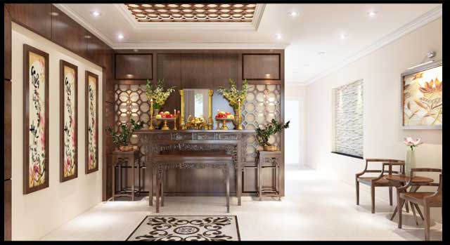 Đối với tầng 3, khu thờ cúng cũng được chúng tôi đặc biệt chú trọng. Không gian được ngoảnh ra sảnh chính mở không khí vào ngôi nhà và tạo nên sự thoáng đãng. Nội thất gỗ sang trọng càng làm cho phòng thờ thêm linh thiêng và độc đáo.