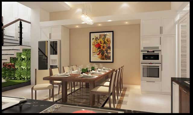Cũng như nhiều mẫu nhà hiện đại khác, việc kết hợp khéo léo giữa nhà bếp, phòng ăn và phòng khách tạo nên một không gian rất logic. Ngoài ra tại chân cầu thang tầng trệt chúng tôi đã bày trí thêm một khu tiểu cảnh rất xanh mát, tạo nên một luồng gió mới thân thiện với tự nhiên cho ngôi nhà này.