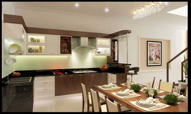 Phòng bếp cực kì ấn tượng với gam màu trắng sữa nổi bật và sang trọng. Khu nhà bếp được xây theo phong cách chữ L quen thuộc, bộ bàn ghế được đặt ngay cạnh để thuận tiện cho việc ăn uống và giữ vệ sinh chung cho cả khu bếp.