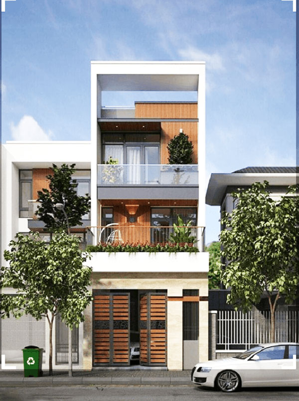Một mẫu thiết kế nhà phố 3 tầng mang phong cách sang trọng, hiện đại. Nét đẹp hiện đại được thể hiện qua cấu trúc hình khối vô cùng đơn giản nhưng đều được tính toán kỹ càng để đảm bảo các yếu tố nhiệt độ, ánh sáng…Vì là nhà phố có diện tích bề ngang hạn chế nên toàn bộ mặt tiền phía trước được trang trí để làm điểm nhấn cho ngôi nhà. Trong thiết kế này điểm nhấn chính là màu nâu gỗ tự nhiên vừa tạo cảm giác hài hòa khi cân bằng sắc trắng, vừa tạo nên ấn tượng sang trọng cho tổng thể thiết kế.