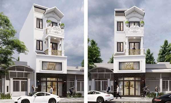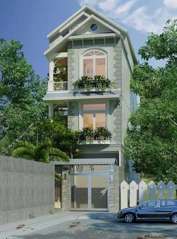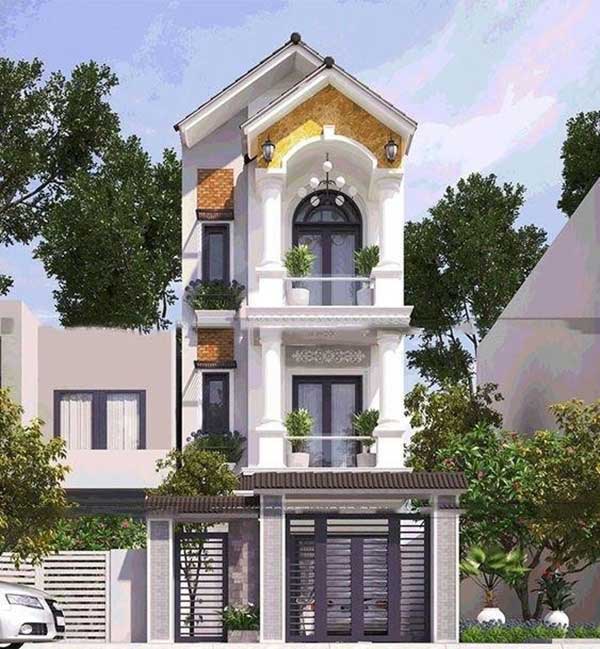 Phong cách tân cổ điển cũng là một lựa chọn thú vị cho thiết kế nhà phố ba tầng. Chi tiết tái hiện đặc trưng cho phong cách này cũng được lựa chọn rất khéo léo để không tạo nên sự lố bịch. Trong thiết kế này, cửa sổ hai lớp hình mái vòm đã thể hiện hoàn hảo tinh thần của phong cách tân cổ điển. Kết hợp với mảng màu vàng nghệ của mái hiên đã hoàn thiện nét đẹp ấn tượng cho căn nhà.