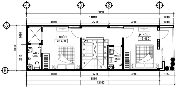 Lên đến khu vực tầng hai được bố trí 2 ngủ cùng với 2 WC bên trong phòng ngủ. Việc bố trí này mang đến sự riêng tư, thuận tiện cho chính người sử dụng. Phân cách hai phòng ngủ là khu vực cầu thang ở giữa.