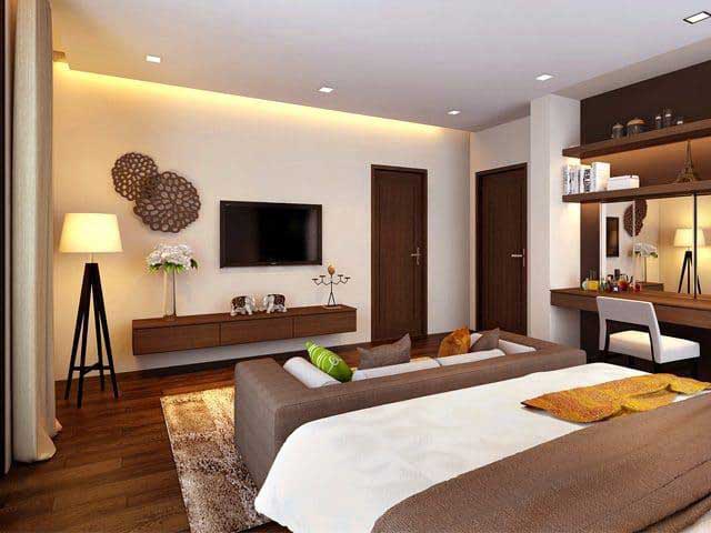 Nội thất phòng khách sử dụng tone màu nâu kem nhã nhặn, ấm cúng.