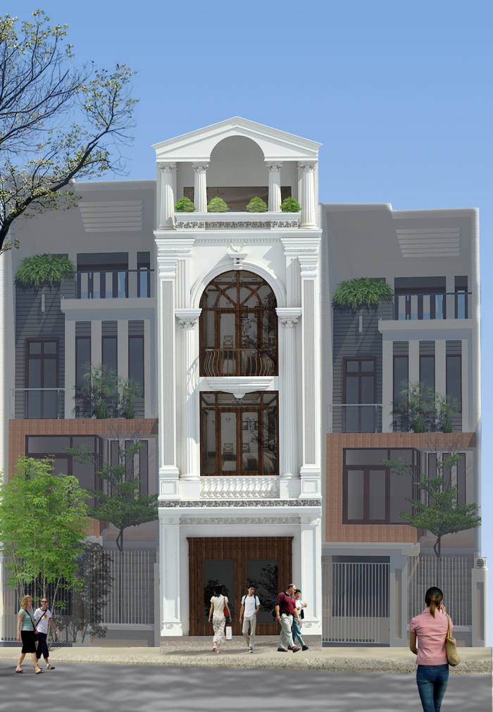 Mẫu nhà phố 4 tầng này được thiết kế với kiểu dáng sang trọng cùng việc bố trí hình khối hợp lý. Với mặt tiền 5m, các kiến trúc sư vẫn thể hiện sự tinh tế qua các họa tiết, hoa văn trang trí theo phong cách tân cổ điển nhưng được giản lược một cách hợp lý nhất. Có thể thấy, kiến trúc tân cổ điển không chỉ được áp dụng cho những căn biệt thự, lâu đài mà còn được ứng dụng trong mẫu nhà phố để mang lại sự thanh lịch đầy cuốn hút. Và, mẫu nhà này là ví dụ điển hình. Tại đây, các kiến trúc sư đã thể hiện sự khéo léo bằng cách lược bỏ những chi tiết rườm rà mà chỉ giữ lại nét tinh tế giúp ngôi nhà thêm sang trọng hơn.