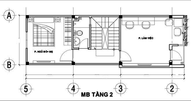 Mặt bằng tầng 2: Phòng ngủ cho bố mẹ rộng rãi – phòng làm việc riêng của gia chủ – phòng vệ sinh – ban công.