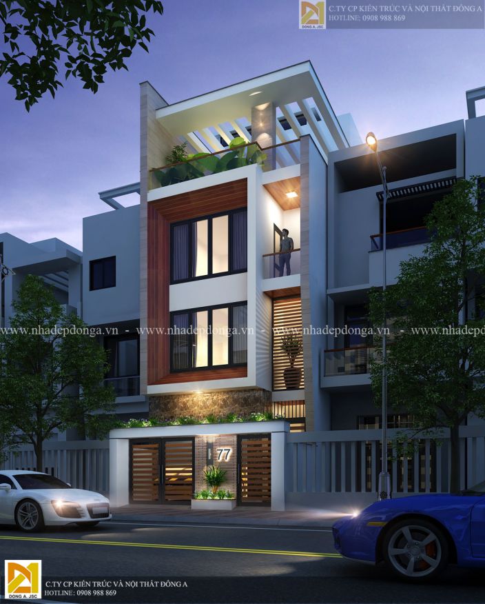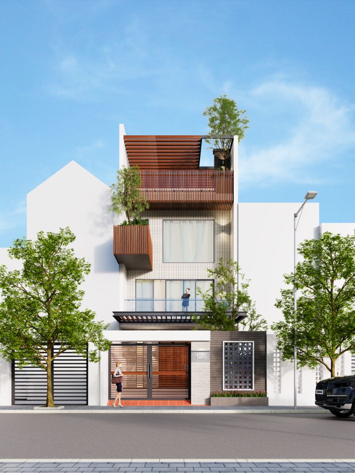 Với tông màu trắng chủ đạo kết hợp với màu gỗ tự nhiên phối hợp nhẹ nhàng, đậm nhạt uyển chuyển đã khiến ngôi nhà phố 4 tầng trở nên nổi bật, khác biệt so với những công trình khác ở xung quanh. Ngoài ra, mẫu nhà phố trên còn được thiết kế, bố trí, điểm xuyết các khoảng xanh từ hệ những chậu cây cảnh từ tầng 1 đến tầng 4 giúp ngôi nhà xanh mát hơn.