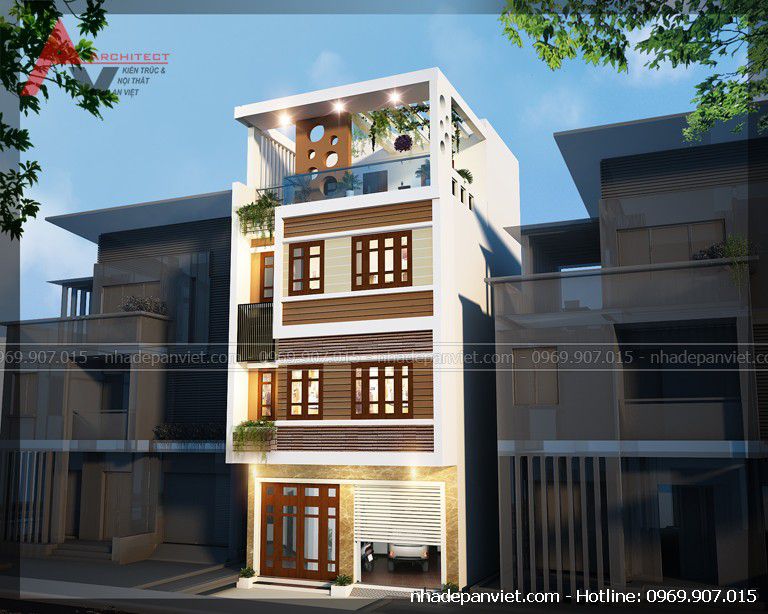 Mẫu nhà phố 4 tầng với mặt tiền 6m mang trong mình sự trang nhã, hiện đại với các đường nét, hình khối thiết kế sắc sảo nhưng vẫn mang lại sự tươi tắn, năng động. Kiến trúc ngoại thất dựa trên phong cách hiện đại không đơn điệu hay nhàm chán bởi các kiến trúc sư đã sáng tạo với những đường nét giật cấp hay những khối hình hộp đưa ra bên ngoài. Mẫu nhà phố thiết kế với tông màu trắng chủ đạo kết hợp thêm gam màu gỗ, đặc biệt là nhỏ với những đường kẻ dọc ấn tượng hài hòa và đồng điệu.