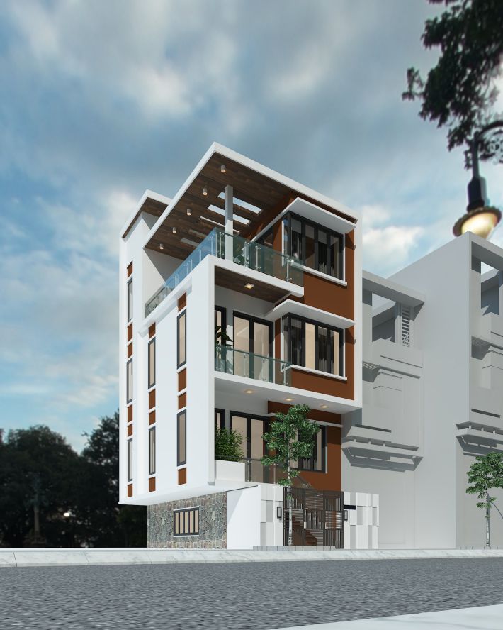 Mẫu nhà phố hiện đại 4 tầng với mặt tiền sử dụng đá marble màu nâu tay ban nha kết hợp với tường ốp gỗ tạo cho công trình thêm phần sang trọng. Ngôi nhà trở nên cá tính hơn với mặt tiền vát cạnh phá cách đầy ấn tượng, không đơn thuần chỉ là những diện tường thẳng hay ban công nhàm chán của mẫu nhà phố khác. Ngôi nhà phố 4 tầng trở nên nhẹ nhàng hơn khi các kiến trúc sư sử dụng những mảng, diện của kính lớn nhằm tạo ra không gian rộng thoáng đãng. Không chỉ chú trọng đến mặt tiền, các kiến trúc sư con kết hợp trồng cây xanh cũng như gạch Inax màu trầm mang lại tổng thể xanh, sạch, đẹp cho ngôi nhà.