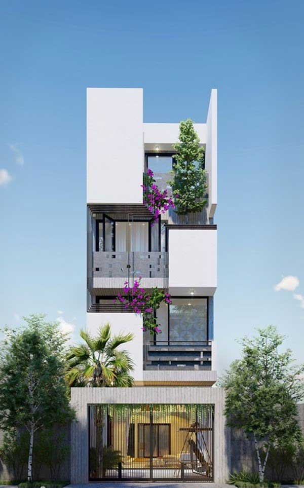 Cũng giống như các mẫu nhà phố 4 tầng khác, căn nhà này đem lại không gian sống thoải mái và vô cùng tiện nghi cho chủ hộ nhờ các công năng được bố trí rải đều ở các tầng. Mặt tiền rộng rãi, kết hợp với ngoại thất và cách bố trí ở mỗi tầng khiến căn nhà trở nên đẹp và ưa nhìn. Gam màu trắng kết hợp với những màu tối của ngoại thất tạo nên sự tương phản cho căn nhà. Ban công rộng rãi, có lam chắn che bớt nắng hắt vào căn nhà, có thể làm nơi tụ họp, xum vầy với nhau và thả tầm ngắm từ trên cao nhìn xuống.