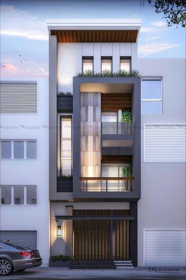 Mẫu nhà phố 4 tầng được thiết kế theo phong cách hiện đại, nổi bật nhờ các khung cửa 5 cánh mỏng và thoáng, bên cạnh là hệ thống cửa sổ rộng được xây dựng thêm bồn hoa phía trước mang đến nét đẹp sang trọng mà vô cùng trẻ trung. Tầng 1 được xây dựng tường rào đổ khối bê tông chắc chắn, ban công có lam chắn và được thiết kế cả kẻ hở thông nắng cũng như gió khiến sân thượng thêm phần thông thoáng và mát mẻ hơn. Gam màu trắng kết hợp cùng màu xam và nâu tạo nên một bức tranh đẹp sống động mà không hề cảm thấy thô cứng. Là mẫu nhà phố đẹp, đang trở thành xu hướng trong thời đại số hiện nay.