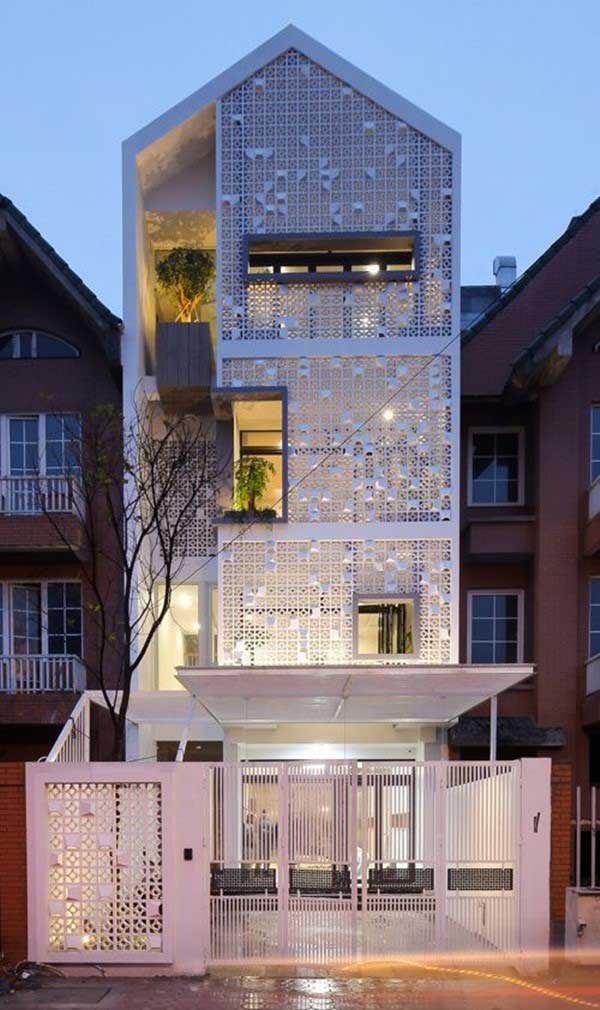 Nổi bật nhờ các mảng tường được xây dựng gạch thông gió màu trắng, giúp căn nhà lấy được ánh sáng và mang lại phong cách rất trẻ trung, hiện đại. Cách sắp xếp ngoại thất cũng như bố cục tạo cho căn nhà sự ấm áp giống như 1 cái tổ kén. Là mẫu nhà phố mang phongcách nghệ thuật mới.