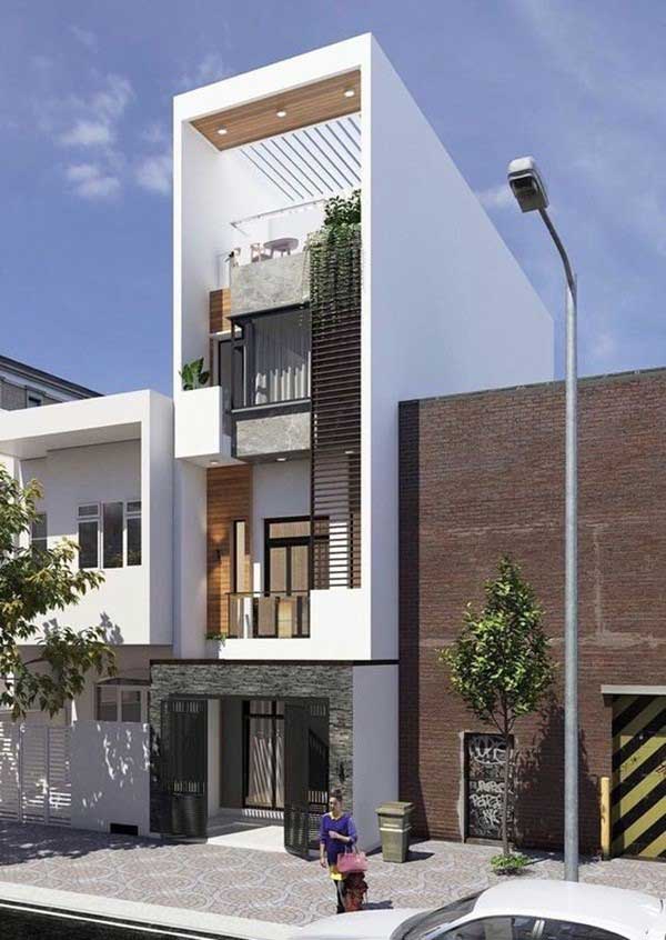 Nổi bật với kiến trúc lệch tầng, cùng cách trang trí đưa không gian xanh tươi mới vào không gian sống, mẫunhà phố 4 tầng trở nên năng động và hiện đại hơn. Mặt tiền rộng rãi, được lắp đặt 2 hệ thống cửa, 1 cửa kéo phía ngoài và cửa kính phía bên trong, vừa đảm bảo an toàn an ninh cho căn nhà, lại còn thông thoáng. Tầng 2 và 3 xây dựng ban công khá nhỏ, nhưng không hề làm giảm đi sự tiện nghi của căn nhà mà nhìn lên, ta có thể thấy cách thiết kế này khiến kiến trúc của căn nhà trở nên thật mới mẻ và năng động. Phần bên cạnh được ốp đá và được trồng thêm dàn dây leo khá đẹp. Sân thượng có thêm lam chắn, thiết kế các rãnh khe để ánh nắng có thể chiếu vào giúp cho hệ sinh thái cây trồng ở sân thượng được hấp thụ tự nhiên mà còn có thể tận dụng để treo cây cảnh, phong lan… là mẫu nhà phố tiêu chuẩn được rất nhiều hộ gia đình săn đón ngày nay.