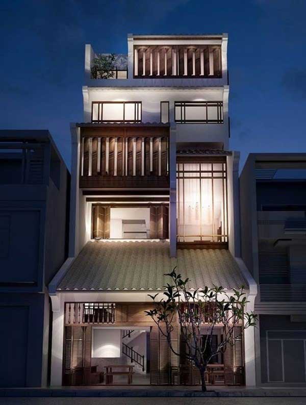 Mang đậm phong cách Việt, mẫu nhà phố tuy chỉ có 40m2 mà mang lại các công năng tiện ích và khiến ai cũng phải say đắm vì nét cổ truyền tinh túy được các KTS thể hiện qua kiến trúc nhà ở. Mặt tiền được thiết kế có mái che lợp bằng ngói, mang hơi thở làng quê Việt Nam qua biết bao nhiêu thế hệ. Hệ thống cửa được thiết kế bằng gỗ dát mỏng, giống như những chiếc mành tre nứa trong các căn nhà dưới vùng quê nghèo. Tầng 2 và 3 mang hơi thở nét đẹp năng động, hiện đại, hệ thống cửa sổ được tận dụng bằng kính cường lực trong suốt, vừa mang tới nét thẩm mỹ cho căn nhà, lại góp phần đón lượng ánh sáng và gió tự nhiên thoảng vào nhà. Đây là mẫu nhà mang nét đẹp hiện đại kết hợp với cổ truyền truyền thống, là mẫu nhà được ưa chuộng hiện nay.