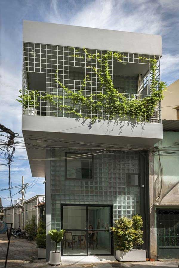 Chỉ vỏn vẹn 40m2, ngôi nhà phố thể hiện được nét đẹp nghệ thuật bởi lối kiến trúc giản dị và vô cùng hiện đại. Mặt tiền được thiết kế bằng gạch kính mờ kết hợp cùng cửa sổ có khung thép tối giản, góp phần thu hút được ánh sáng và thông gió tự nhiên mà không làm mất đi sự riêng tư bên trong căn nhà. Ban ngày, căn nhà nổi bật và hòa vào trong nắng, ban đêm lại thêm lung linh và huyền ảo nhờ ánh đèn trong nhà chiếu sáng xuyên qua các khung kính, tạo nên nét đẹp mềm mại mà vô cùng mới mẻ. Phù hợp với các bạn trẻ năng động trong thời đại số hiện nay.