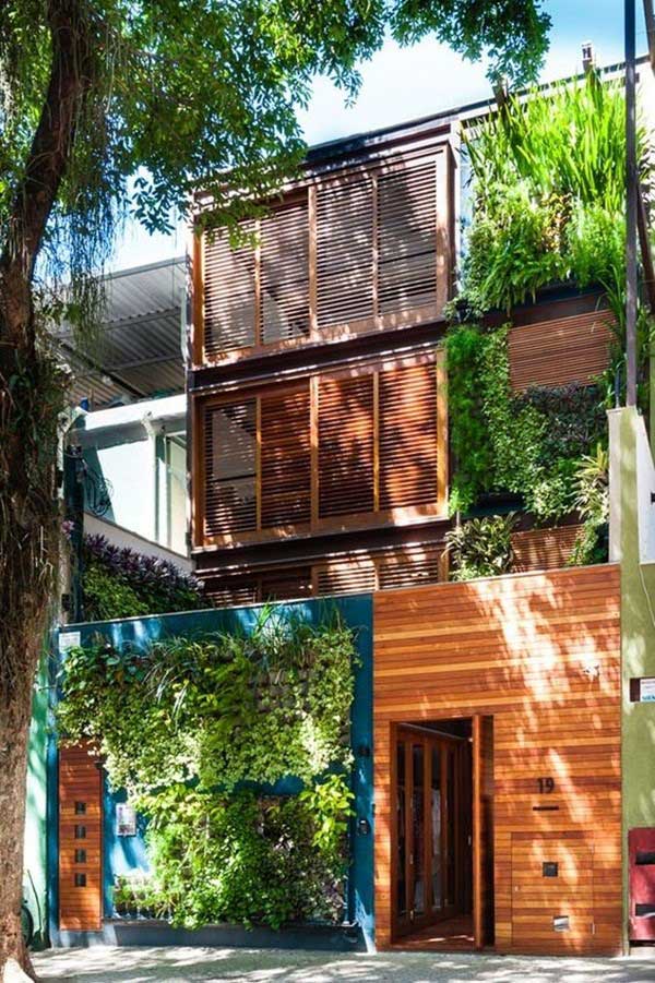 Vẻ đẹp tươi mới căn tràn sức sống với gam màu sắc trẻ trung năng động chính là phong cách mà căn nhà phố 40m2 này mang lại. Mặt tiền có thiết kế với cửa chính nhỏ gọn, trên tường có trang trí cây xanh phủ kín góp phần làm cho căn nhà trở nên tươi mới và thoáng mát hơn. Tầng trên có hệ thống cửa bằng gỗ với nhiều ngăn có các kẻ hở khiến gió và nắng có thể luồn vào bên trong, tạo một không gian sống thoáng mát và thoải mái.